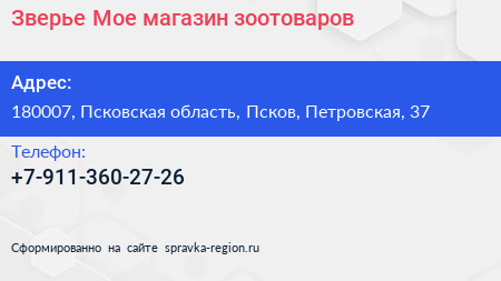 Зверье Мое, магазин зоотоваров по адресу 180007, Псковская область, Псков, Петровская, 37 в дальнейшем Организация, размещена в следующих категориях: