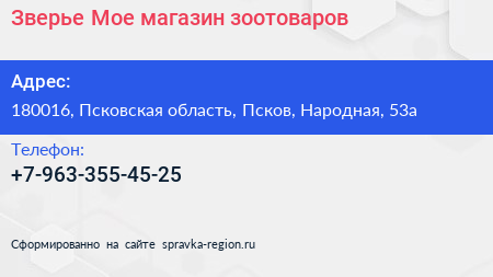 Зверье Мое, магазин зоотоваров по адресу 180016, Псковская область, Псков, Народная, 53а в дальнейшем Организация, размещена в следующих категориях:
