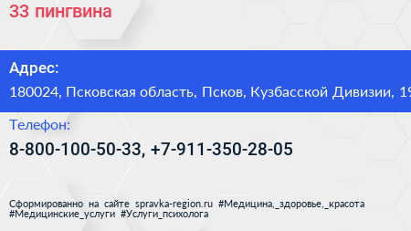 33 пингвина по адресу 180024, Псковская область, Псков, Кузбасской Дивизии, 19 в дальнейшем Организация, размещена в следующих категориях: