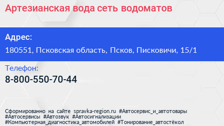 Артезианская вода, сеть водоматов по адресу 180551, Псковская область, Псков, Писковичи, 15/1 в дальнейшем Организация, размещена в следующих категориях: