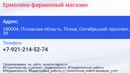 Ермолино, фирменный магазин по адресу 180004, Псковская область, Псков, Октябрьский проспект, 39 в дальнейшем Организация, размещена в следующих категориях: