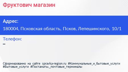Фруктович, магазин по адресу 180004, Псковская область, Псков, Лепешинского, 10/1 в дальнейшем Организация, размещена в следующих категориях: