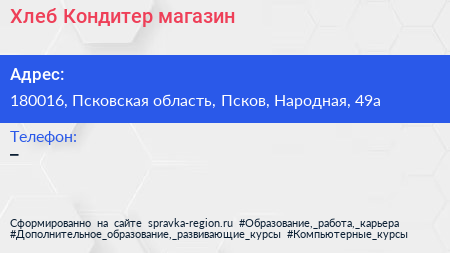 Хлеб & Кондитер, магазин по адресу 180016, Псковская область, Псков, Народная, 49а в дальнейшем Организация, размещена в следующих категориях: