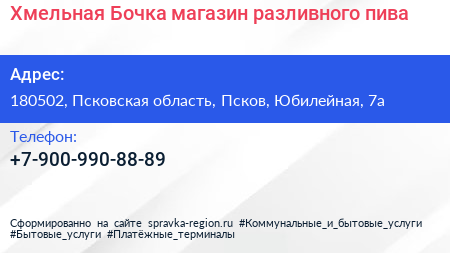 Хмельная Бочка, магазин разливного пива по адресу 180502, Псковская область, Псков, Юбилейная, 7а в дальнейшем Организация, размещена в следующих категориях: