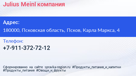 Julius Meinl, компания по адресу 180000, Псковская область, Псков, Карла Маркса, 4 в дальнейшем Организация, размещена в следующих категориях: