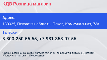 КДВ Розница, магазин по адресу 180025, Псковская область, Псков, Коммунальная, 73а в дальнейшем Организация, размещена в следующих категориях: