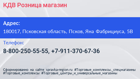 КДВ Розница, магазин по адресу 180017, Псковская область, Псков, Яна Фабрициуса, 5В в дальнейшем Организация, размещена в следующих категориях: