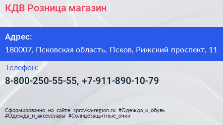 КДВ Розница, магазин по адресу 180007, Псковская область, Псков, Рижский проспект, 11 в дальнейшем Организация, размещена в следующих категориях: