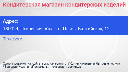 Кондитерская, магазин кондитерских изделий по адресу 180024, Псковская область, Псков, Балтийская, 12 в дальнейшем Организация, размещена в следующих категориях: