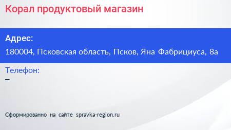 Корал, продуктовый магазин по адресу 180004, Псковская область, Псков, Яна Фабрициуса, 8а в дальнейшем Организация, размещена в следующих категориях: