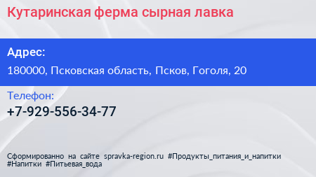 Кутаринская ферма, сырная лавка по адресу 180000, Псковская область, Псков, Гоголя, 20 в дальнейшем Организация, размещена в следующих категориях: