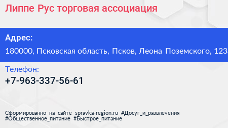 Липпе Рус, торговая ассоциация по адресу 180000, Псковская область, Псков, Леона Поземского, 123а в дальнейшем Организация, размещена в следующих категориях: