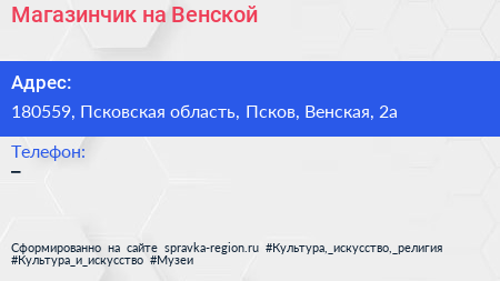 Магазинчик на Венской по адресу 180559, Псковская область, Псков, Венская, 2а в дальнейшем Организация, размещена в следующих категориях: