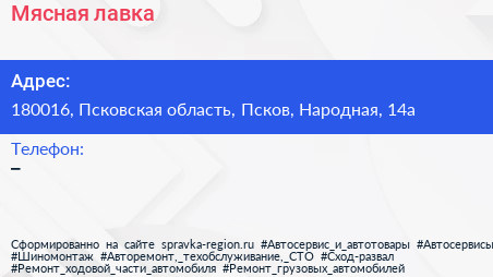 Мясная лавка по адресу 180016, Псковская область, Псков, Народная, 14а в дальнейшем Организация, размещена в следующих категориях: