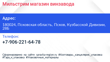 Мильстрим, магазин винзавода по адресу 180024, Псковская область, Псков, Кузбасской Дивизии, 28Б в дальнейшем Организация, размещена в следующих категориях: