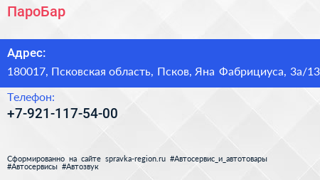 ПароБар по адресу 180017, Псковская область, Псков, Яна Фабрициуса, 3а/13 в дальнейшем Организация, размещена в следующих категориях: