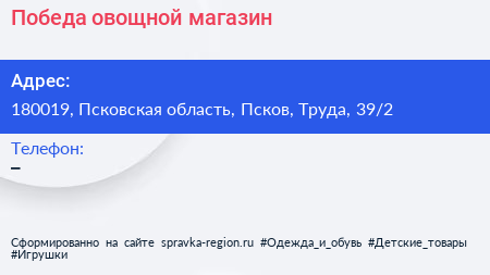 Победа, овощной магазин по адресу 180019, Псковская область, Псков, Труда, 39/2 в дальнейшем Организация, размещена в следующих категориях: