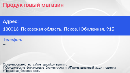 Продуктовый магазин по адресу 180016, Псковская область, Псков, Юбилейная, 91Б в дальнейшем Организация, размещена в следующих категориях: