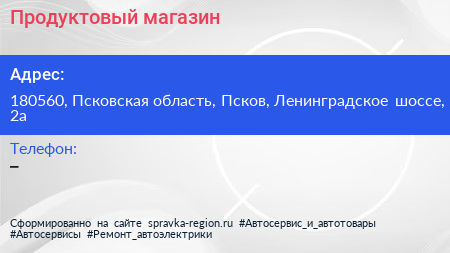 Продуктовый магазин по адресу 180560, Псковская область, Псков, Ленинградское шоссе, 2а в дальнейшем Организация, размещена в следующих категориях: