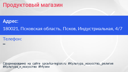 Продуктовый магазин по адресу 180021, Псковская область, Псков, Индустриальная, 4/7 в дальнейшем Организация, размещена в следующих категориях: