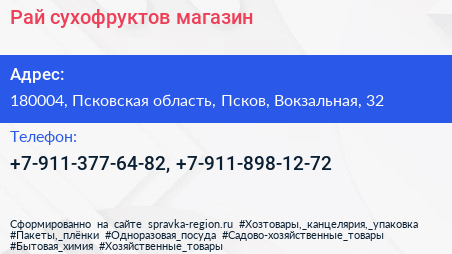 Рай сухофруктов, магазин по адресу 180004, Псковская область, Псков, Вокзальная, 32 в дальнейшем Организация, размещена в следующих категориях:
