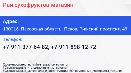 Рай сухофруктов, магазин по адресу 180016, Псковская область, Псков, Рижский проспект, 49 в дальнейшем Организация, размещена в следующих категориях: