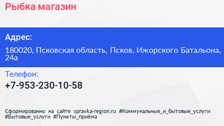 Рыбка, магазин по адресу 180020, Псковская область, Псков, Ижорского Батальона, 24а в дальнейшем Организация, размещена в следующих категориях: