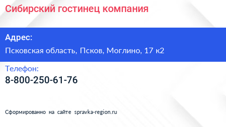 Сибирский гостинец, компания по адресу Псковская область, Псков, Моглино, 17 к2 в дальнейшем Организация, размещена в следующих категориях: