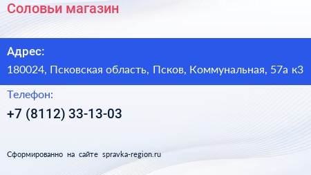 Соловьи, магазин по адресу 180024, Псковская область, Псков, Коммунальная, 57а к3 в дальнейшем Организация, размещена в следующих категориях: