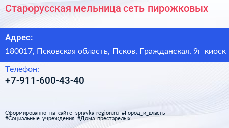 Старорусская мельница, сеть пирожковых по адресу 180017, Псковская область, Псков, Гражданская, 9г киоск в дальнейшем Организация, размещена в следующих категориях: