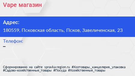 Vape, магазин по адресу 180559, Псковская область, Псков, Завеличенская, 23 в дальнейшем Организация, размещена в следующих категориях: