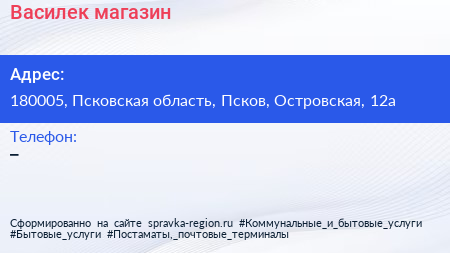 Василек, магазин по адресу 180005, Псковская область, Псков, Островская, 12а в дальнейшем Организация, размещена в следующих категориях: