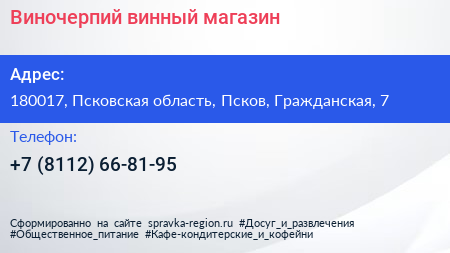 Виночерпий, винный магазин по адресу 180017, Псковская область, Псков, Гражданская, 7 в дальнейшем Организация, размещена в следующих категориях: