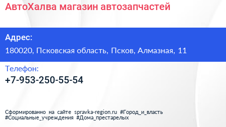 АвтоХалва, магазин автозапчастей по адресу 180020, Псковская область, Псков, Алмазная, 11 в дальнейшем Организация, размещена в следующих категориях: