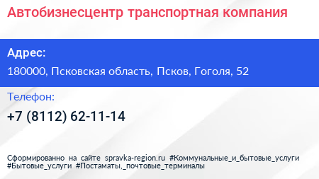 Автобизнесцентр, транспортная компания по адресу 180000, Псковская область, Псков, Гоголя, 52 в дальнейшем Организация, размещена в следующих категориях: