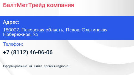 БалтМетТрейд, компания по адресу 180007, Псковская область, Псков, Ольгинская Набережная, 9а в дальнейшем Организация, размещена в следующих категориях: