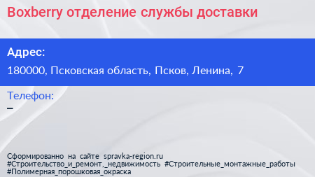 Boxberry, отделение службы доставки по адресу 180000, Псковская область, Псков, Ленина, 7 в дальнейшем Организация, размещена в следующих категориях: