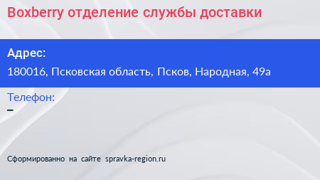 Boxberry, отделение службы доставки по адресу 180016, Псковская область, Псков, Народная, 49а в дальнейшем Организация, размещена в следующих категориях: