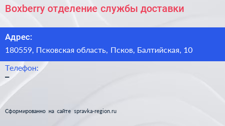 Boxberry, отделение службы доставки по адресу 180559, Псковская область, Псков, Балтийская, 10 в дальнейшем Организация, размещена в следующих категориях:
