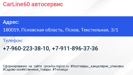 CarLine60, автосервис по адресу 180019, Псковская область, Псков, Текстильная, 3/1 в дальнейшем Организация, размещена в следующих категориях: