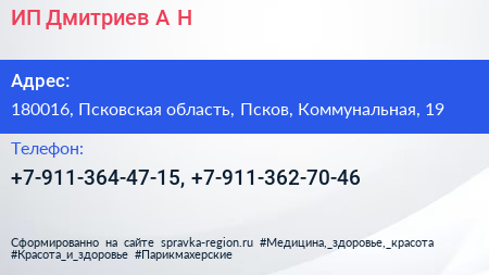ИП Дмитриев А.Н. по адресу 180016, Псковская область, Псков, Коммунальная, 19 в дальнейшем Организация, размещена в следующих категориях: