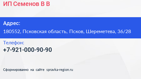 ИП Семенов В.В. по адресу 180552, Псковская область, Псков, Шереметева, 36/28 в дальнейшем Организация, размещена в следующих категориях: