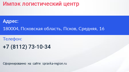 Импэк, логистический центр по адресу 180004, Псковская область, Псков, Средняя, 16 в дальнейшем Организация, размещена в следующих категориях: