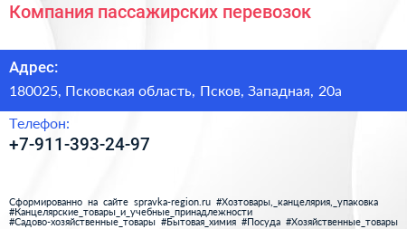 Компания пассажирских перевозок по адресу 180025, Псковская область, Псков, Западная, 20а в дальнейшем Организация, размещена в следующих категориях: