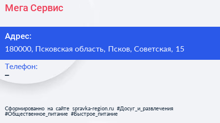 Мега Сервис по адресу 180000, Псковская область, Псков, Советская, 15 в дальнейшем Организация, размещена в следующих категориях: