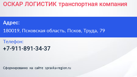 ОСКАР ЛОГИСТИК, транспортная компания по адресу 180019, Псковская область, Псков, Труда, 79 в дальнейшем Организация, размещена в следующих категориях: