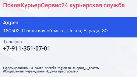 ПсковКурьерСервис24, курьерская служба по адресу 180502, Псковская область, Псков, Уграда, 30 в дальнейшем Организация, размещена в следующих категориях: