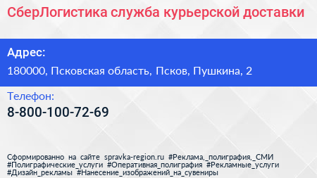 СберЛогистика, служба курьерской доставки по адресу 180000, Псковская область, Псков, Пушкина, 2 в дальнейшем Организация, размещена в следующих категориях: