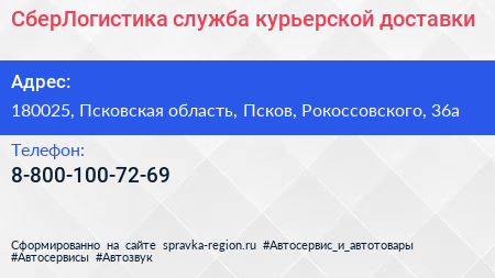 СберЛогистика, служба курьерской доставки по адресу 180025, Псковская область, Псков, Рокоссовского, 36а в дальнейшем Организация, размещена в следующих категориях: