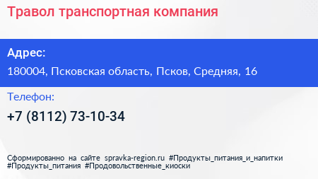 Травол, транспортная компания по адресу 180004, Псковская область, Псков, Средняя, 16 в дальнейшем Организация, размещена в следующих категориях: